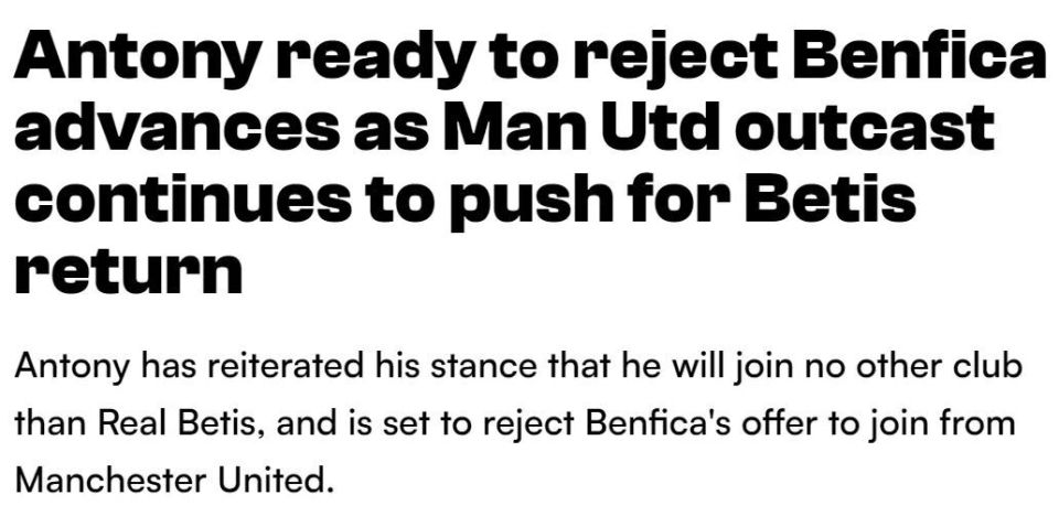 曼联的1亿欧元先生安东尼并不缺少下家,最近葡超豪门本菲卡也向他表达了兴趣。然而,25岁的巴西边锋只想重返皇家贝蒂斯,再次拒绝其他转会出路,对此红魔相当无可奈何。